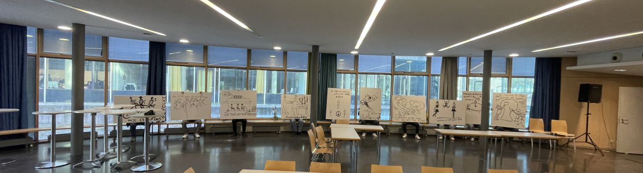 Die Tische im Raum luden die Schüler*innen ein, selbst kreativ zu werden und ihre eigenen Entwürfe zu malen.